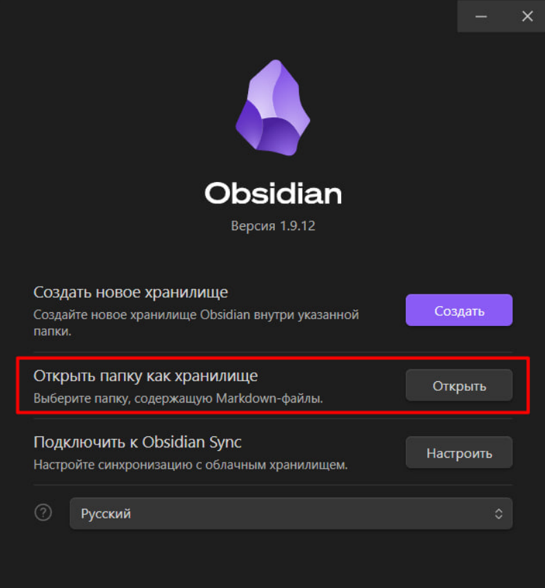 После клонирования актуального Git- репозитория необходимо открыть весь проект как папку в Obsidian. Для этого его открываем и выбираем “Открыть папку как хранилище”: В Проводнике выбираем скаченную из GitHub папку: