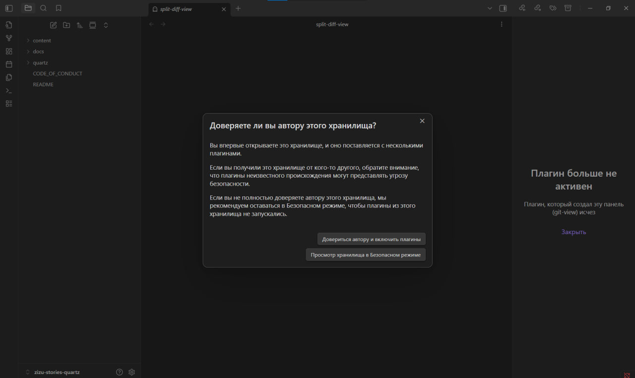 Соглашаемся с угрозами от Obsidian, жмём “Довериться автору и включить плагины” (Необходимо для работы Obsidian Git и Dataview):